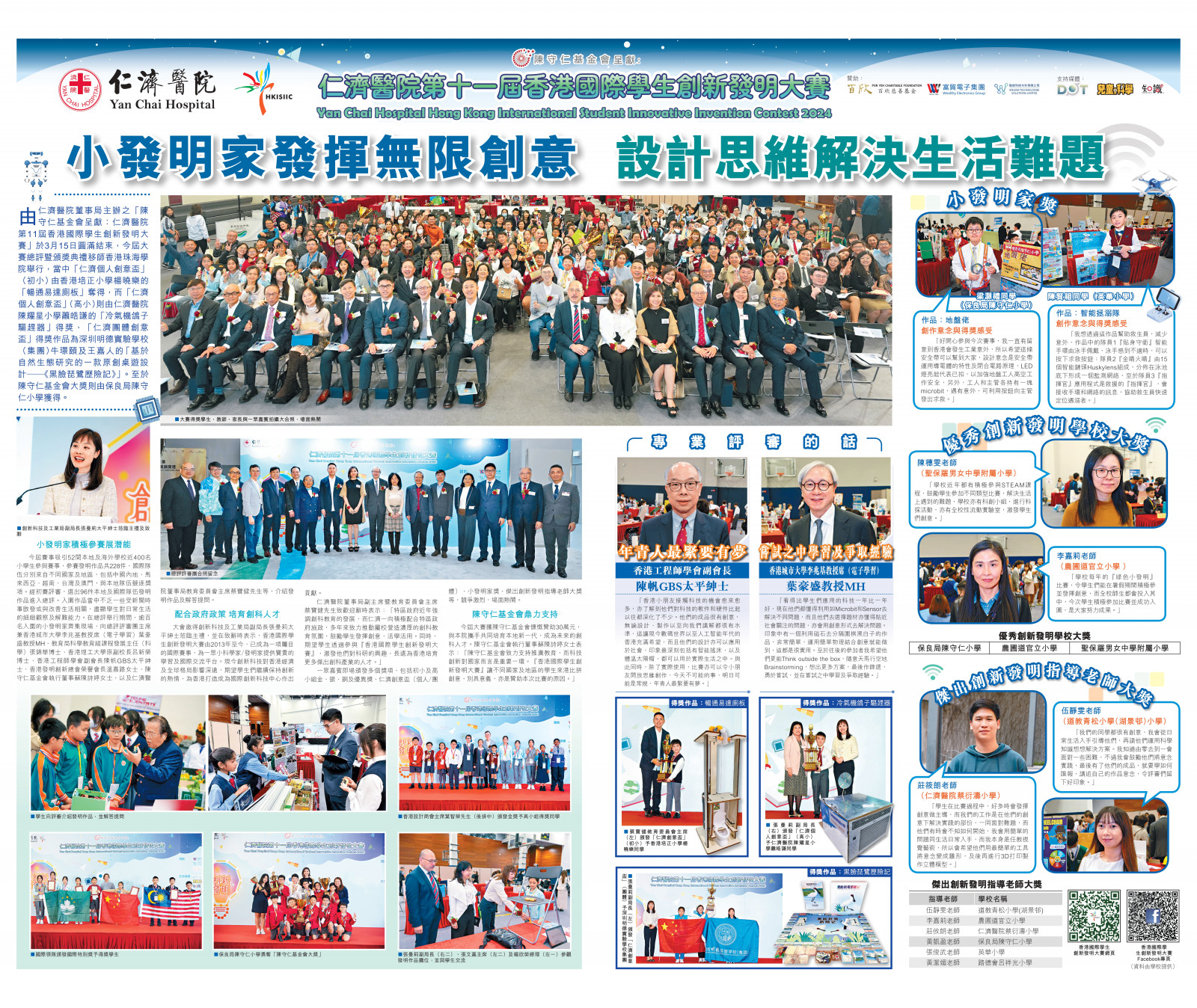 此外,本校伍靜雯主任於同場榮獲「傑出創新發明指導老師大獎」,充分肯定其於培育學生發明創新上的貢獻,伍主任更獲《星島日報》專訪分享指導心得,為校爭光。