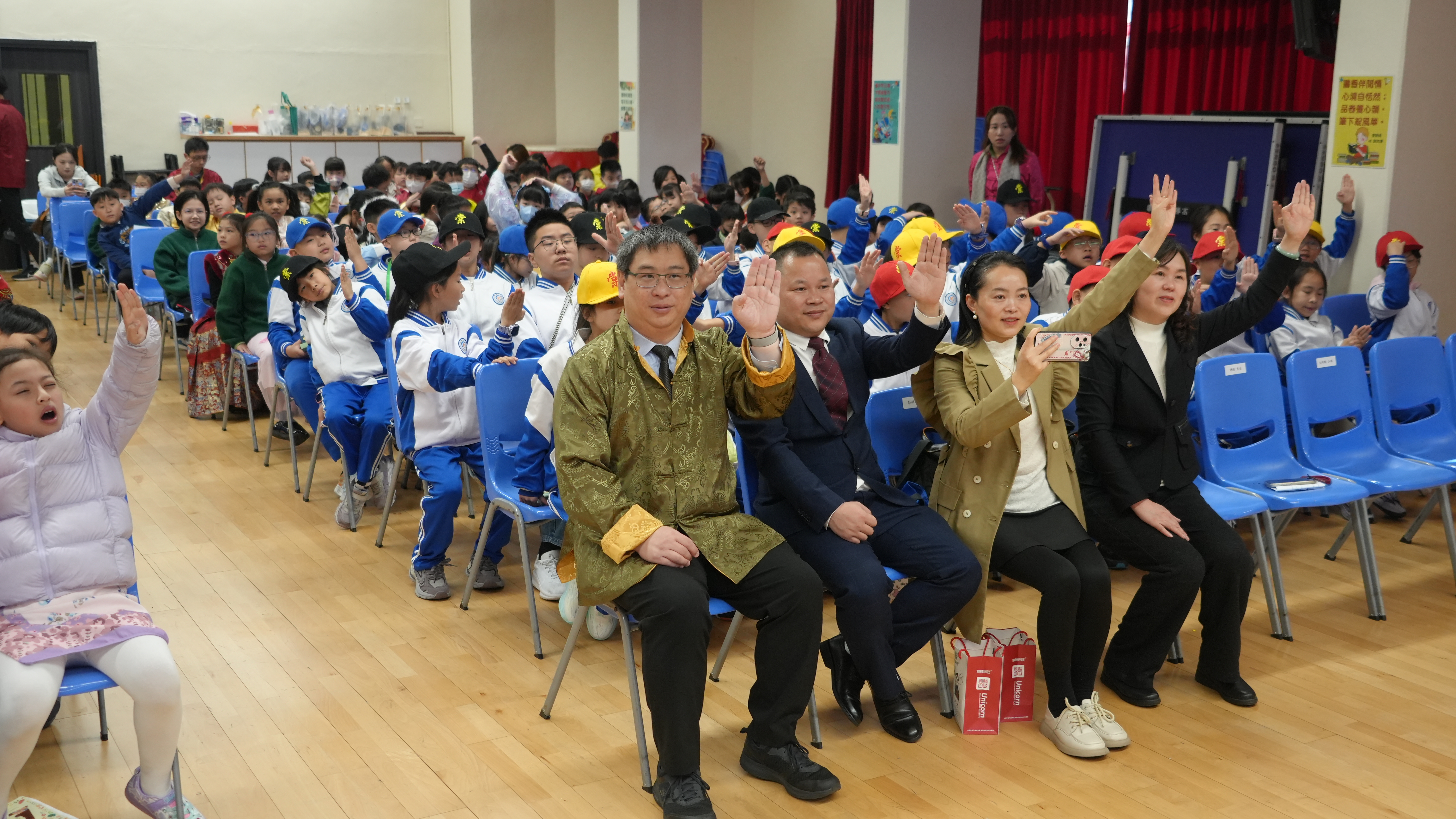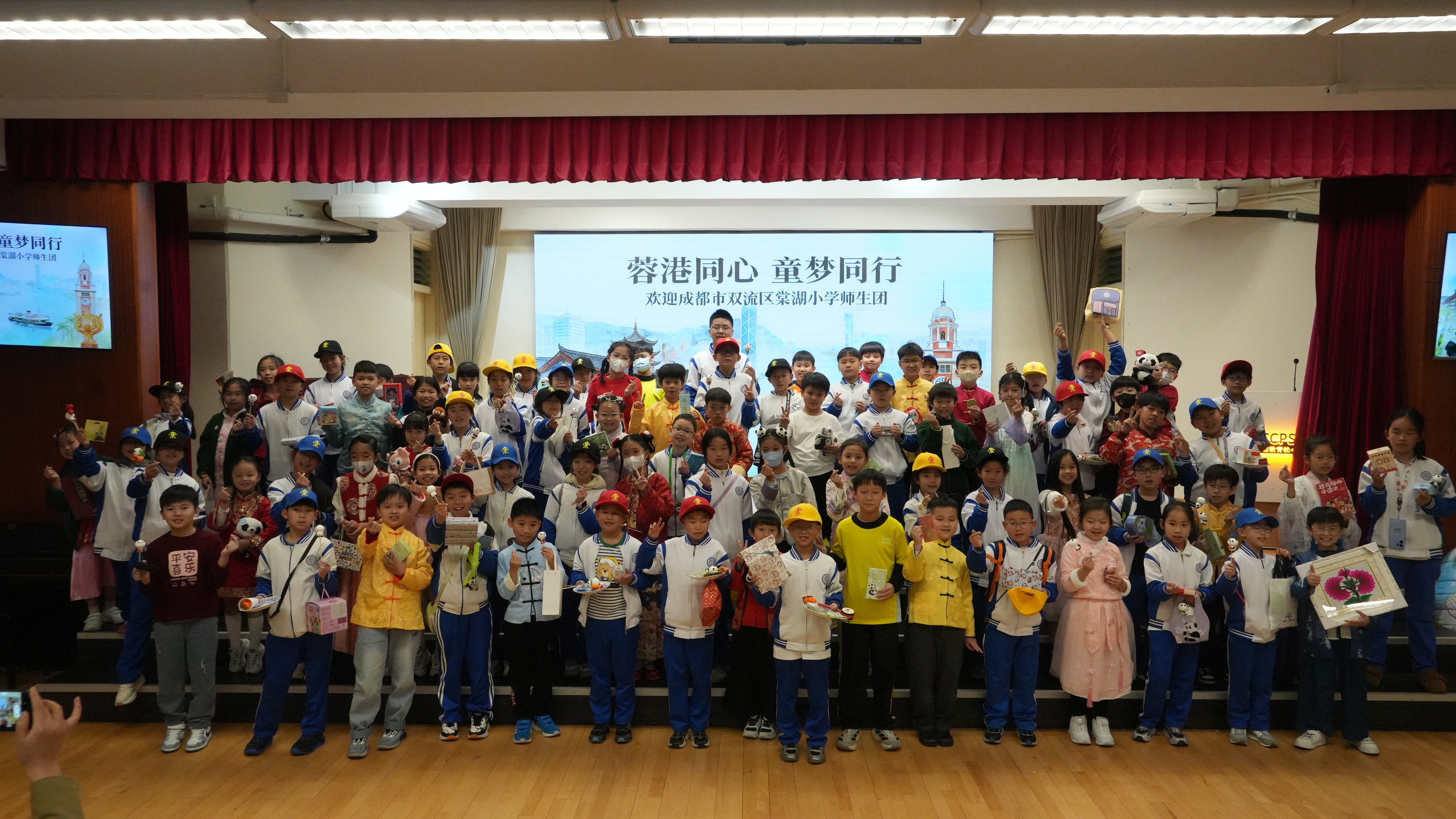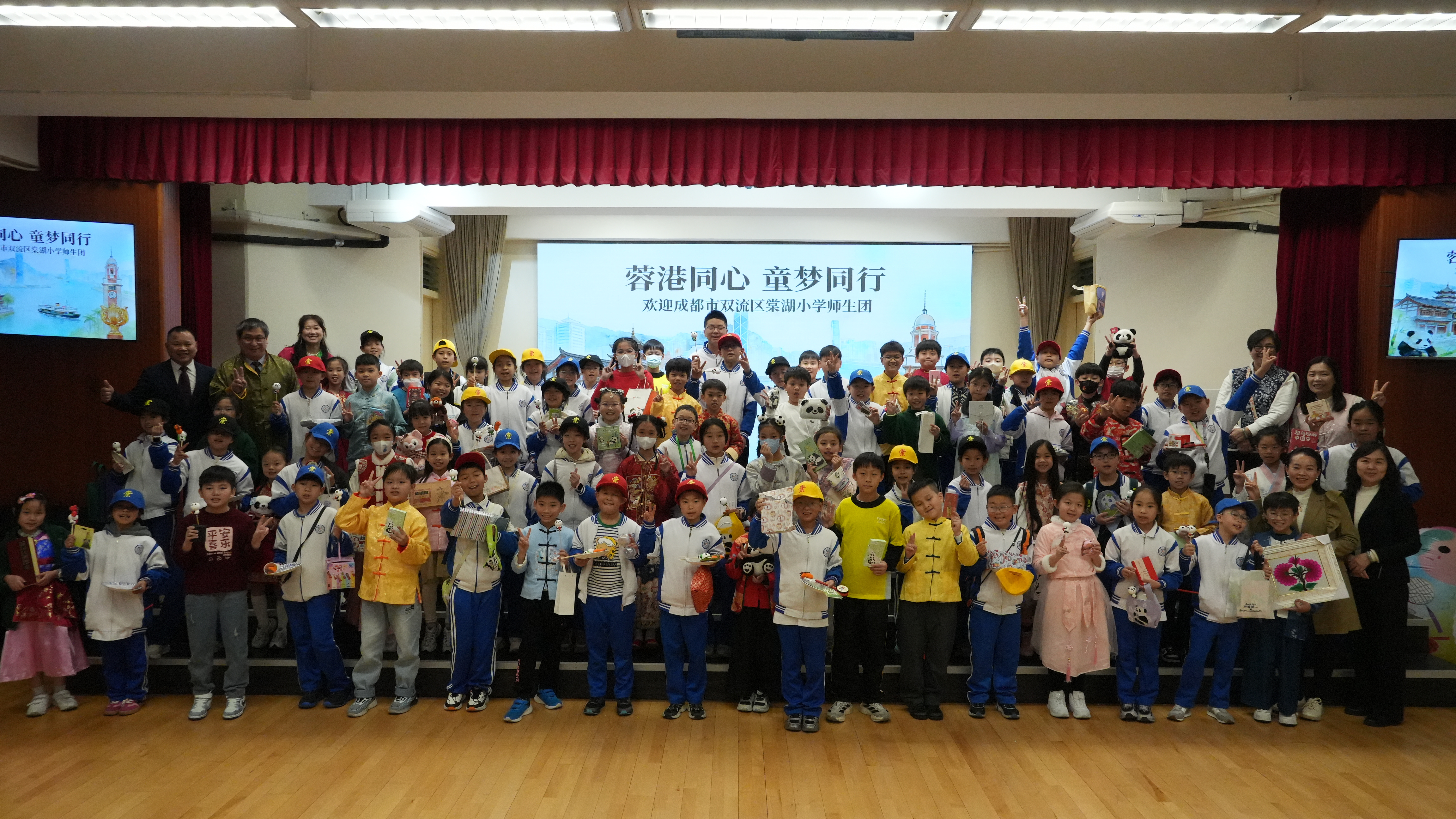 成都巿雙流區棠湖小學師生團自前年STEAM WEEK活動後,於本學年2月3日再度蒞臨本校作親善探訪,並參與「中華文化日」活動。本校40位學生大使與棠小同學進行配對,化身「小導遊」帶領友校夥伴投入各項文化體驗。活動當日精彩紛呈,歡迎儀式既有合唱團與中國鼓表演,更邀得香港武術運動員莫宛螢小姐親臨獻技,並親自教授同學武術招式。兩校學生隨後一同參與攤位遊戲及中華手工藝工作坊,在歡笑中領略傳統文化精髓。臨別前,同學們互換禮物留念,象徵兩地姊妹學校情誼永固。