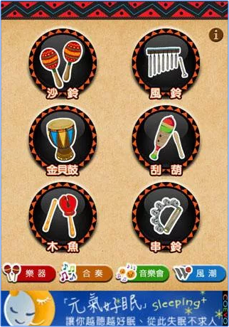 ![]() ![]() 以敲擊樂器爲主,可通過觸控或搖動方式單獨演奏或使用多種樂器進行大合奏。 |