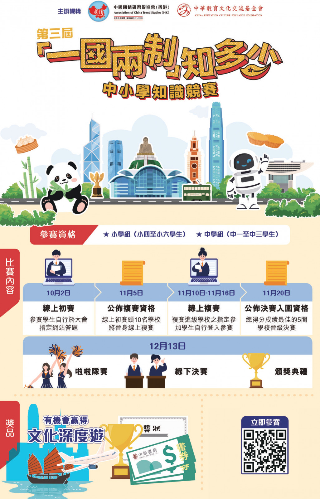 賽以學校為單位進行,線上初賽環節將於10月2日上午9時舉行,設有小學組(小四至小六)和中學組(中一至中三)兩個組別。各組排名首十名之學校將進入11月10日至16日之線上複賽,決賽暫定為12月13日(六) 於城市大學禮堂線下較量,爭奪各大獎項。詳情可參閱競賽網站https://hkocts.hk/ 及附件之參賽指南。