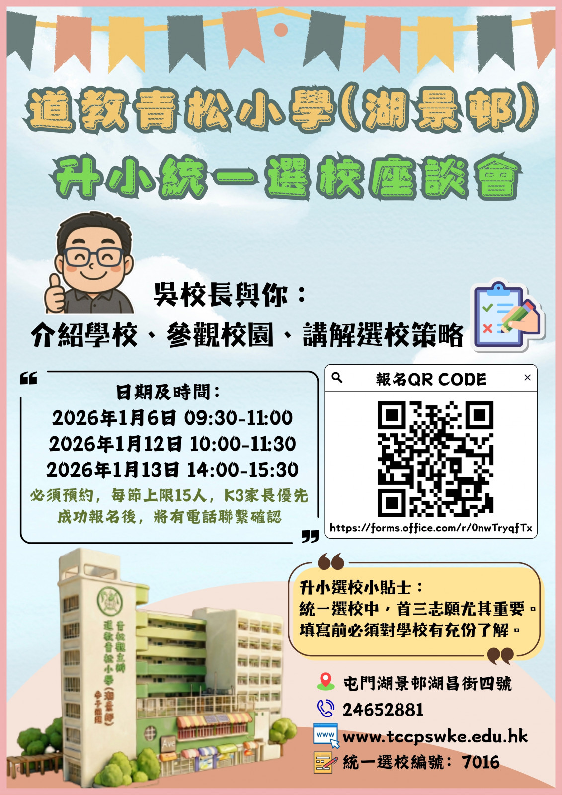 各位參與升小統一派位的家長,首三志願由其重要。所以填寫表格前必須對學校有充份了解。 期待您們到校了解,讓我們一起探索青松湖小的特色!