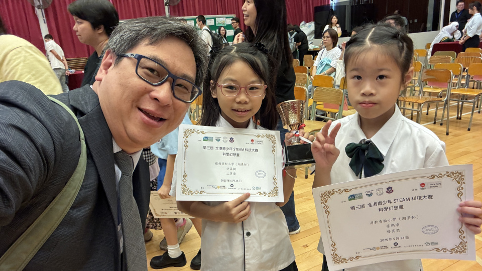 我校同學積極參與由澳洲建造師學會(香港) AIB、香港珠海學院、鐘聲慈善社胡陳金枝中學等合辦的「第三屆全港青少年STEAM科技大賽」。同學們在發明品組及科學幻想畫組中都取得優異的成績,並在5月24日出席了頒獎典禮。吳校長亦有親身到場支持及分享他們的喜悅。