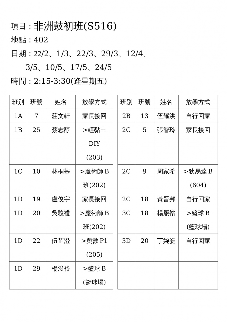 學校歸程隊路線及解散地點修訂資料